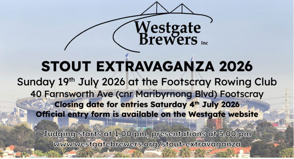 It’s time again for the Westgate Brewers Stout Extravaganza. Judging is on Sunday 19 July at the Footscray Rowing Club and the entry deadline is Saturday 4 July. I’m assuming this is the drop off deadline too but keep an eye on their website for exact details closer to the date.